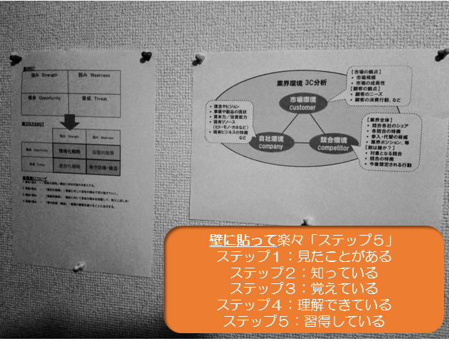 エビングハウスの忘却曲線は、「人間の脳は1週間後に77%忘れる」と言っています。逆説的に「毎日見ていれば忘れないのでは…」という仮説にのっとり、壁一面ペタペタ企業経営理論を貼っていた訳です。