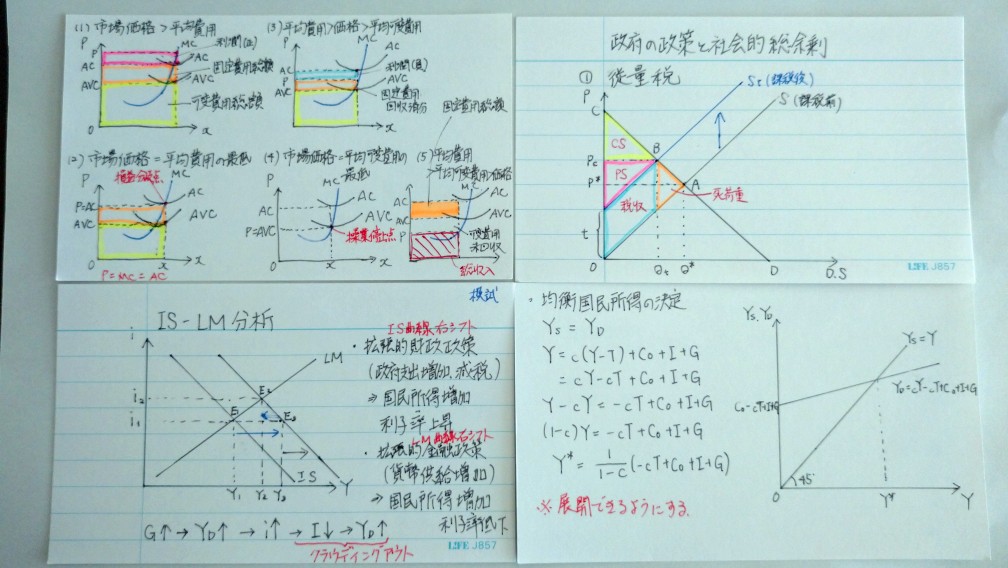 この時書き写した項目は「45°線分析」「乗数効果」「IS-LM分析」「AD曲線」等々ですが、このような出来事があったこともあり、苦手なマクロ経済学の分野であったにも関わらず理解も早かったですし、その後の演習問題にも対応できました。