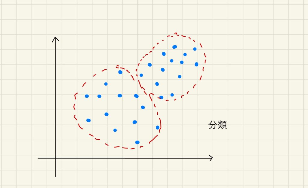 対して、分類は次の図です。モデル群を2つ以上のカテゴリに分けることです。こんなイメージ。集団内でデータの距離の近いなどの似たもの同士をグルーピングします。代表的なものはクラスター分析です。