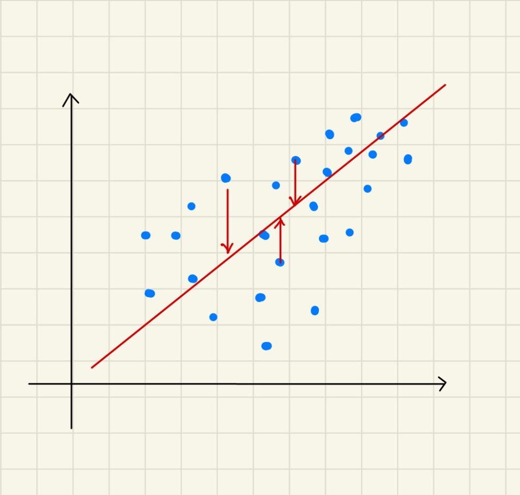回帰では、「実績値と回帰モデルの予測値の差が小さい」ほど良いとされます。どう言うことかと言うと、下図は直線(予測値)と点(実績値)の差を赤い矢印で表しています。この赤い矢印の距離が短ければ短いほど良いモデルというイメージです。この赤い矢印は、具体的にはMAPEやMSEといった指標に対応します。