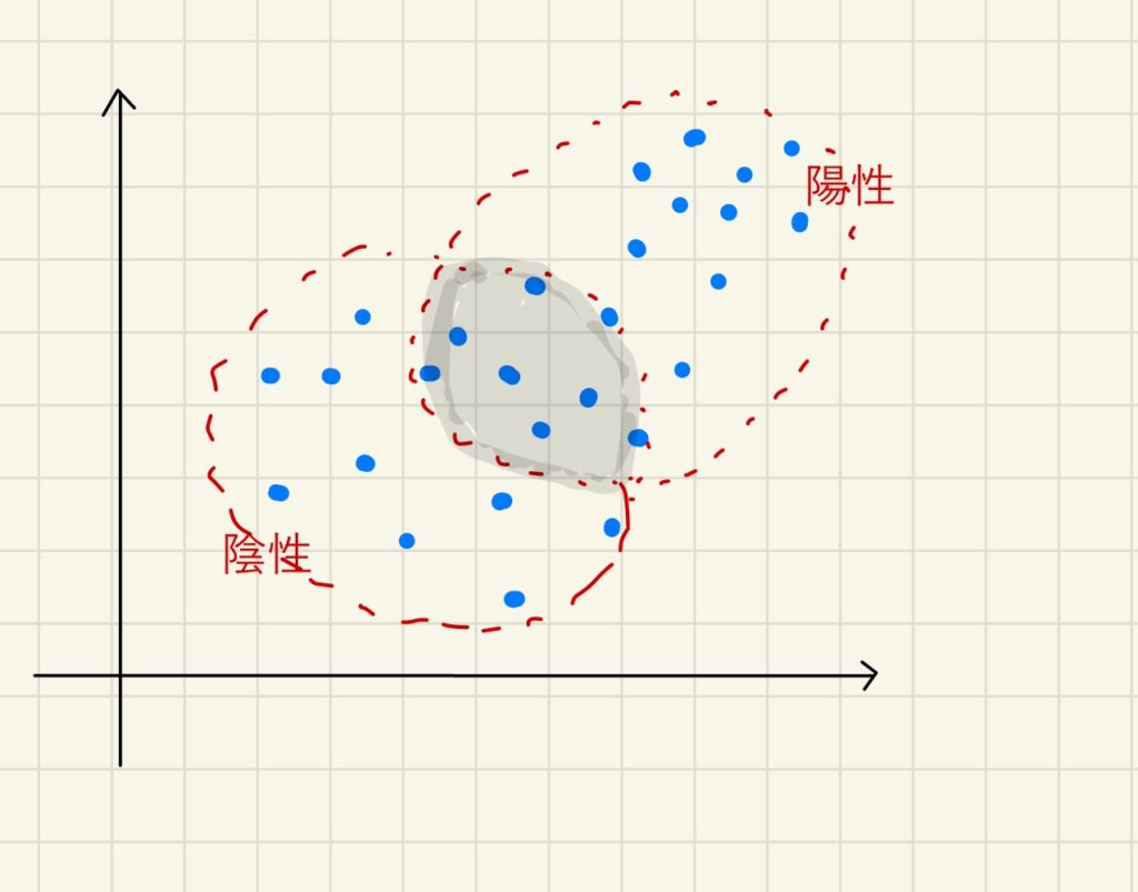 対して、分類は良し悪しを適合率や再現率といったもので評価します。つまり、せっかく分類するのに「偽陽性(FP)」や「偽陰性(FN)」が多い場合は良いモデルといえないと判断します。偽陽性や偽陰性が発生する理由は、分類する領域が被っているからです。下図の分類モデルの中の灰色部分を小さくして重なる部分を減らしていくことで正確な分類モデルになる、とイメージしてください。