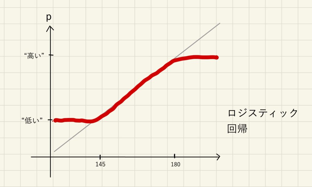 そんな時は分類も可能な「ロジスティック回帰」を使いましょう。わかりやすくするため、身長180cmなら「高い」、身長145cmなら「低い」と必ず判定されると仮定します。(説明のための極端な例ですので、数字自体に意味はありません。念のため)