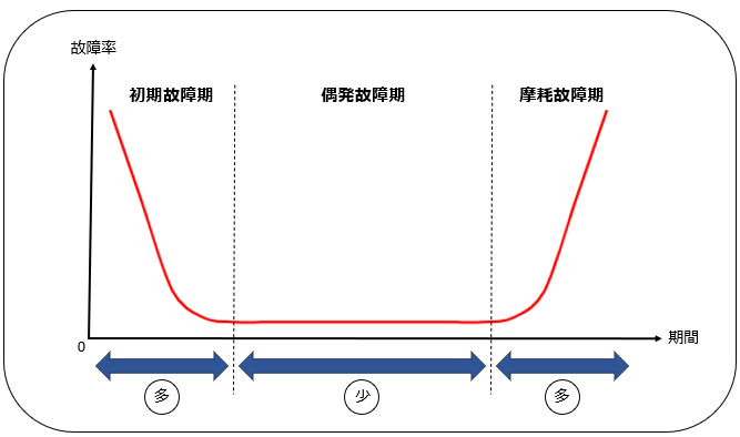 偶発故障期…故障が少ない期間であり、初期故障期や摩耗故障期と比較して安定期となる。