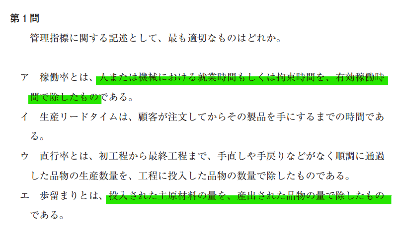 選択肢アに関して、稼働率とは「人または機械における就業時間もしくは利用可能時間に対する有効稼働時間との比率」(JIS Z 8141-1237)のことであり、「有効稼働時間/人または~の就業時間もしくは~」を意味します。しかし選択肢では分母分子が逆になってしまっているため、アは正しくありません。