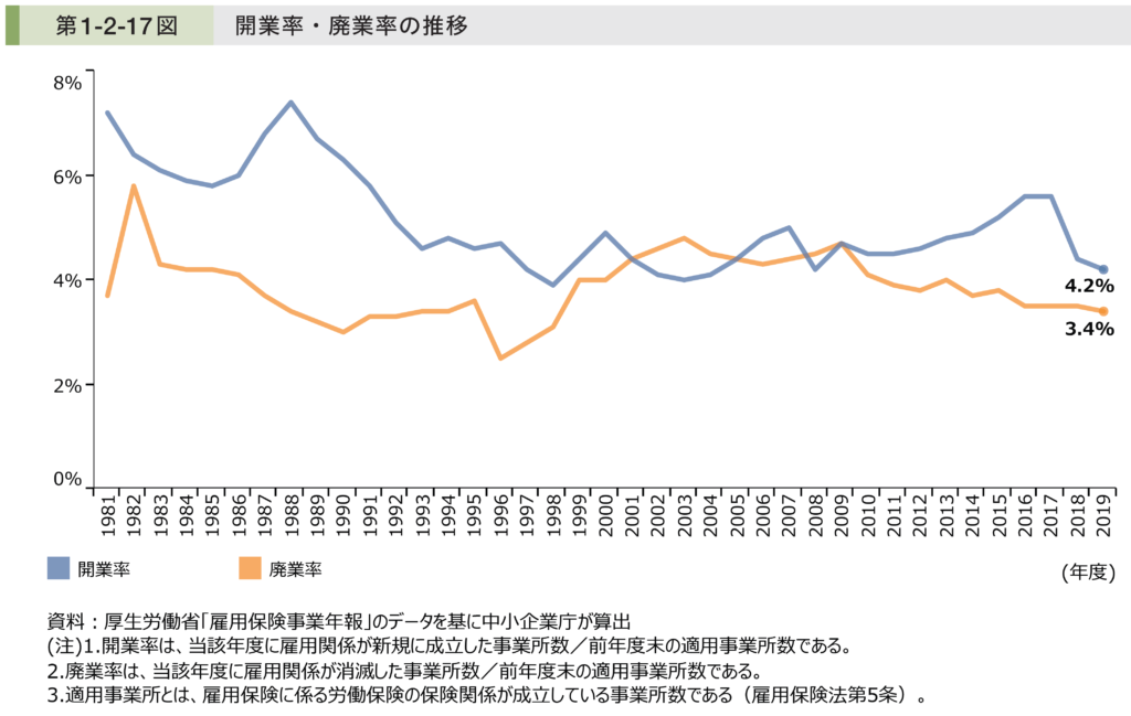 なお、ここでは事業所における雇用関係の成立を開業、消滅を廃業とみなしている。開業率は当該年度に雇用関係が新規に成立した事業所数を前年度末の適用事業所数で除して算出する。廃業率は当該年度に雇用関係が消滅した事業所数を前年度末の適用事業所数で除して算出する。適用事業所とは、雇用保険に係る労働保険の保険関係が成立している事業所である(雇用保険法第5条)。