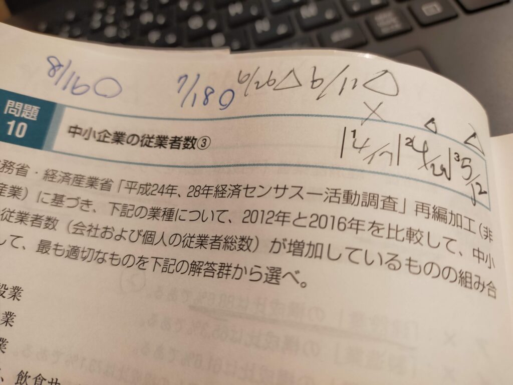 この問題はこのグラフの形を「知っているか知らないか」になってしまいますが、定番問題は正解率も高いですから落とすことは許されません。グラフの形や数字を暗記し、問題集を何度も反復して、業種毎の順位や近年の増減状況などを「呼吸するように正解できる」状態が望ましいです。正解は「オ」です。