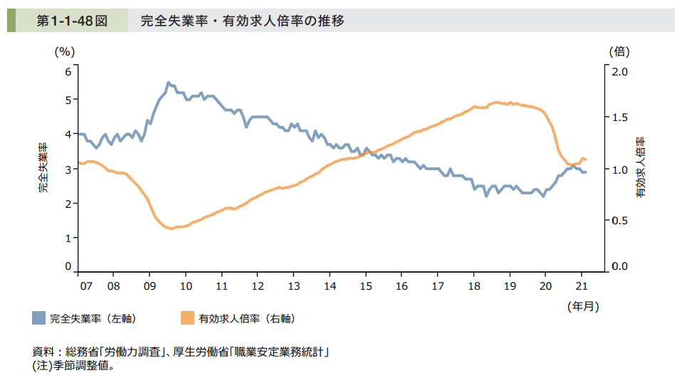 例)2021年版の中小企業白書において、完全失業率・有効求人倍率の以下推移があります。