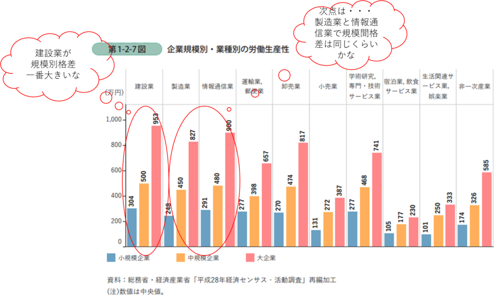 下のグラフをご覧ください。企業規模別・業種別の労働生産性のグラフです。