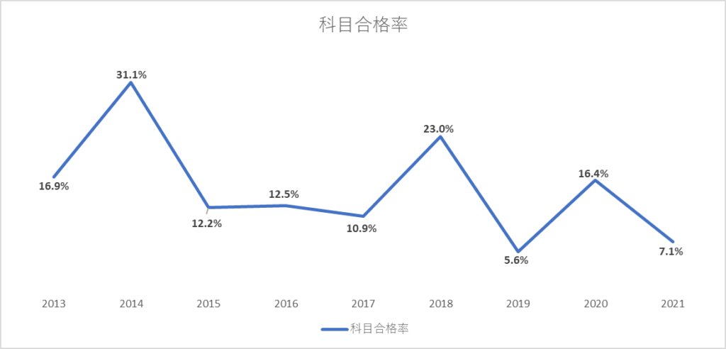 勉強方法の前に、中小企業経営・政策の近年の傾向から見ていきましょう。過去10年間の科目合格率の推移を調べると、1年おきに易化、難化が交互に入れ替わっています。この法則で行くと、今年は易化!みなさん、安心しましょう。