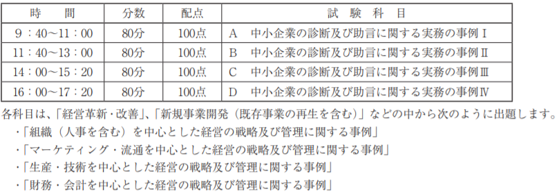 二次筆記試験は、以下の通り、4つの試験から構成されています。(出典:令和3年度中小企業診断士 第二次試験案内・申込書)