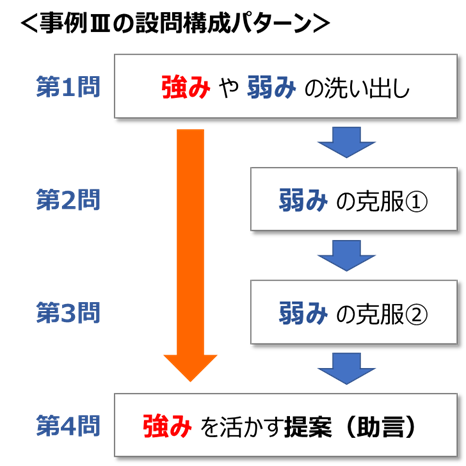 事例Ⅲは最初に「強み」「弱み」を答えさせて、第2問以降で「弱みの克服」について考え、最後に「強みを活かす提案」をするのが王道パターンです。