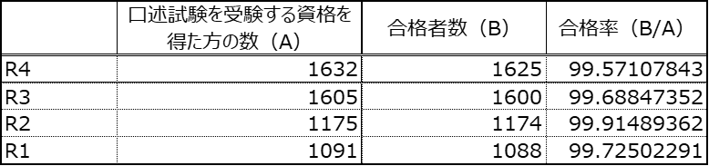 口述試験は通常の試験と異なり、落とすための試験ではありません。合格率が99%を超えていることがその証です。