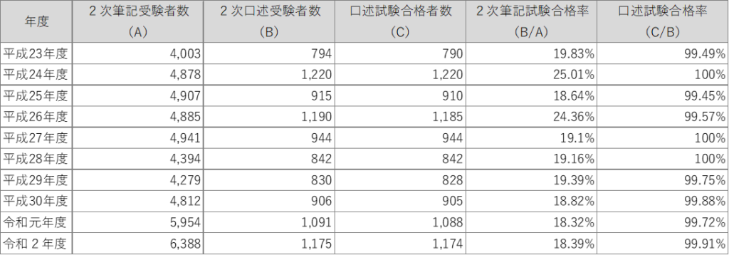 表「2次筆記試験と口述試験の受験者数と合格率の推移」