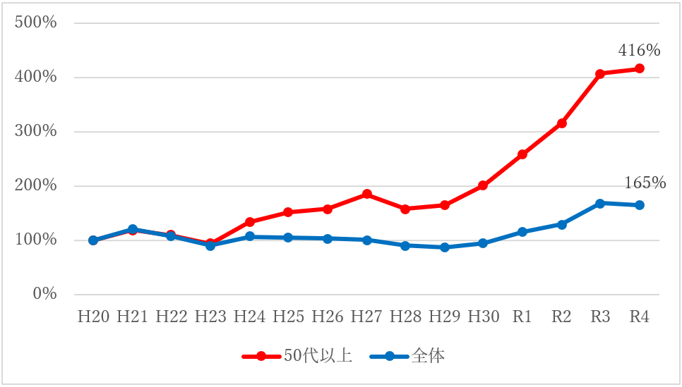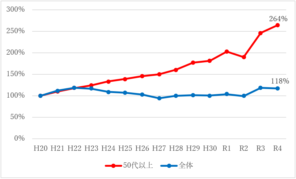 平成20年度からの15年間の推移として、中小企業診断士試験の申込者のうち50代以上の申込者は申込者全体をはるかに上回るペースで増加しています。