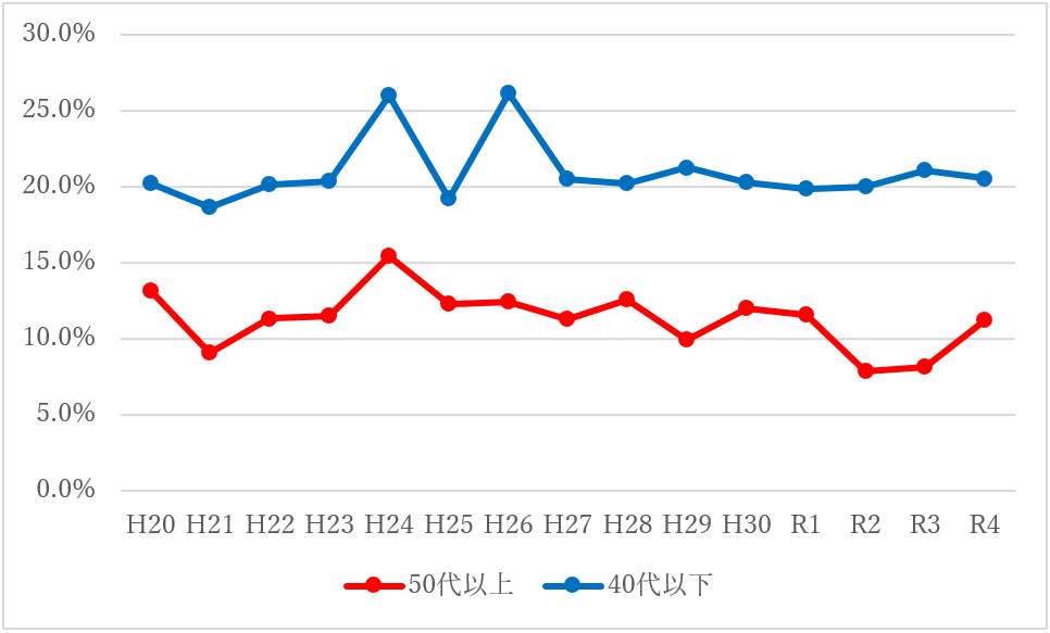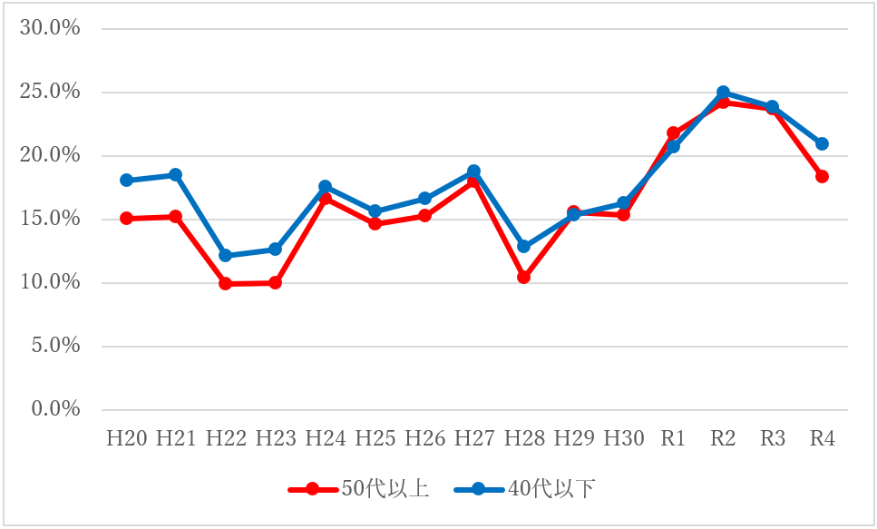 ●図9:2次試験の申込者に対する合格率の推移の、50代以上と40代以下との比較