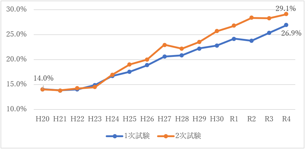 その結果、申込者全体に占める50代以上の割合は、平成20年度では1次・2次ともに約14%のところ、令和4年度には約2倍(1次:約27%、2次:約29%)に増加しています。