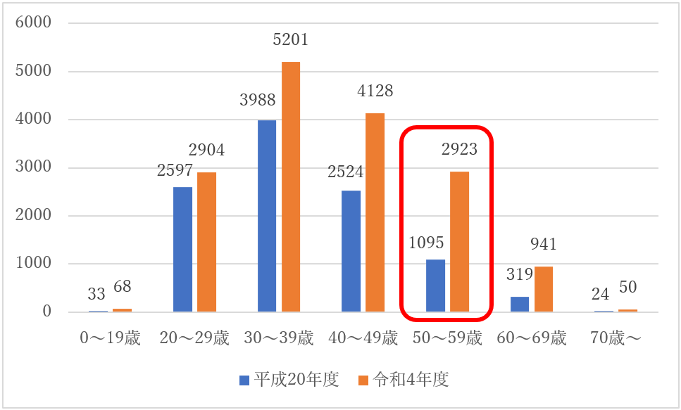 人口1千万人あたりの1次試験申込者の割合を年代別に算出のうえ、平成20年度と令和4年度を比較したところ、50代における申込者割合が最も増加しており20代と逆転しています。