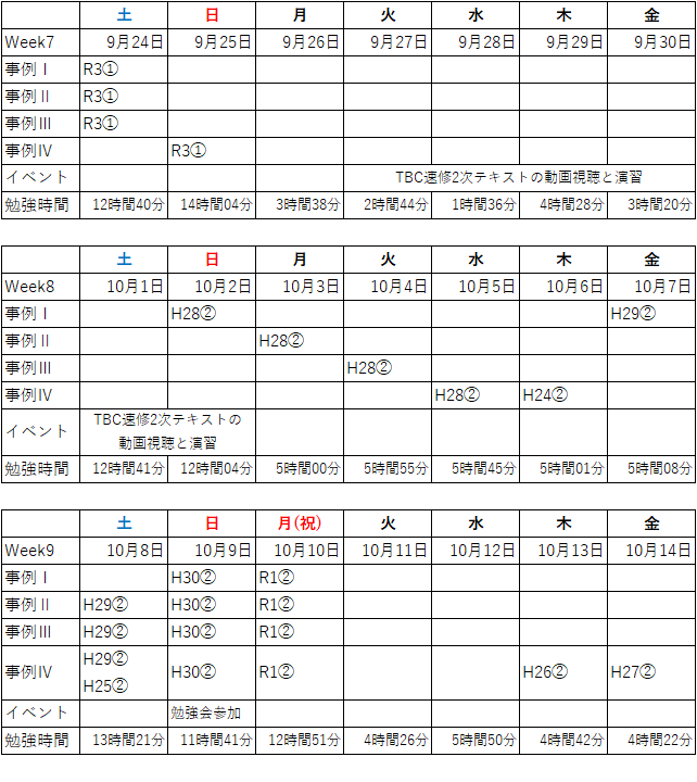 - (4)TBC速修2次テキストの演習(事例Ⅰ~Ⅲ)(9月27日~10月2日)