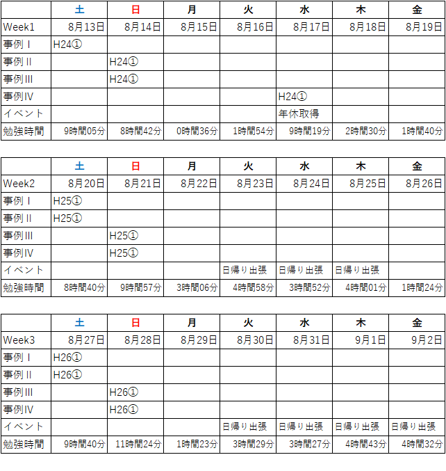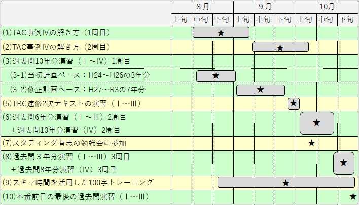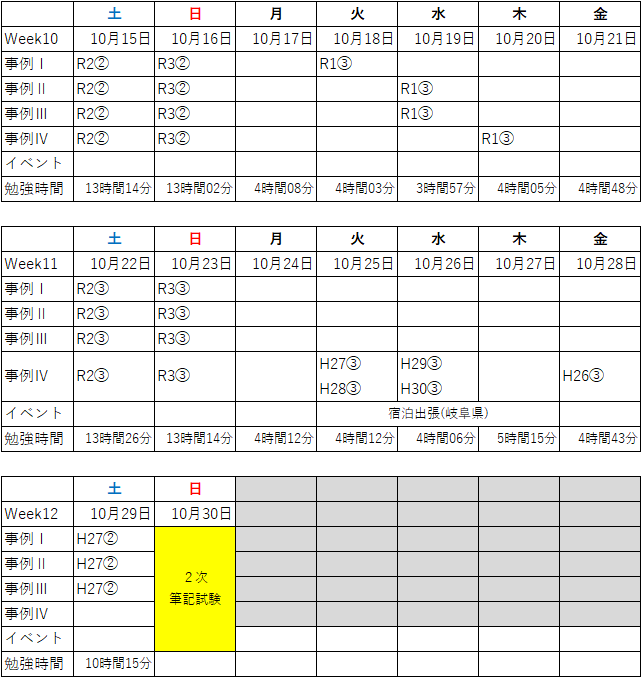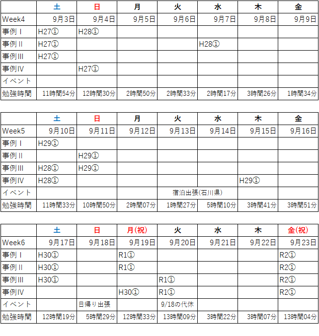 - (5)過去問6年分演習(事例Ⅰ~Ⅲ)+10年分演習(事例Ⅳ)2周目(10月2日~10月18日)