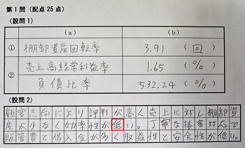 1文字だけ消す例として、令和2年度事例Ⅳの第1問設問2の解答で「効率性がい」を「効率性がい」と、わざと1文字間違えて書いてみました。
