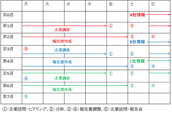 ・15日は、企業訪問、報告会や、メンバーが集まっての分析等に要する日数であって、実際は6週間フル稼働。→仕事・プライベートとの両立が大変。