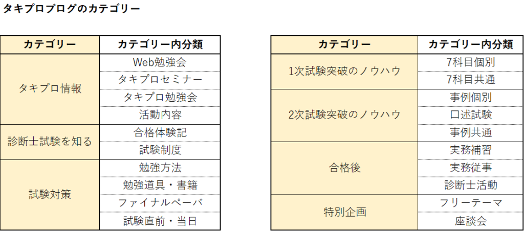 それぞれの勉強方法(1次試験、2次試験)、合格体験記、合格後の実務従事・実務補習などカテゴリー別に分けられているため、その時々で受験生のニーズに合致した参考にしたい情報を迅速に収集できます。これは他の受援生支援団体と差別化できるタキプロの強みになるでしょう。