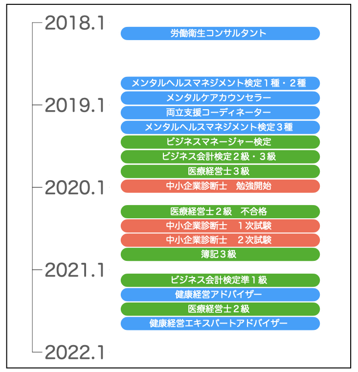 最初は労働衛生系のもの(青)を取って、そこからマネジメント系や経営系(緑)のものへ、そして中小企業診断士(赤)を取って、最近は労働衛生系と経営系の両方が活かせる健康経営系になった感じですね。目的のものは一通り集めました。