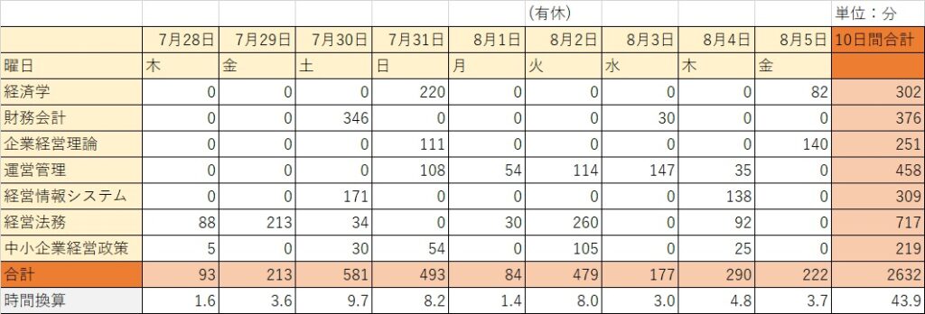 科目ごとの時間配分は、なんとも総花的な印象です。最後は特定科目に集中するよりも、今までやってきたことを振返る期間にしていたと思います。その中でも、『経営法務』については最後に多めに時間を割いていますね。余談ですが、昨年は経営法務が基本的な内容を問われる問題が多かったため、最後に一生懸命勉強したのはすごくよかったと思います。逆に、今更どうしようもない『経済学』や『財務会計』は捨てて、『中小企業経営政策』や『経営情報システム』を重視しても良かったかなあなんて思いますが・・・まあ、終った後だと何とでも言えますけどね。ともあれ、皆さんなりの時間配分があるかと思いますが、参考にしていただけると幸いです。