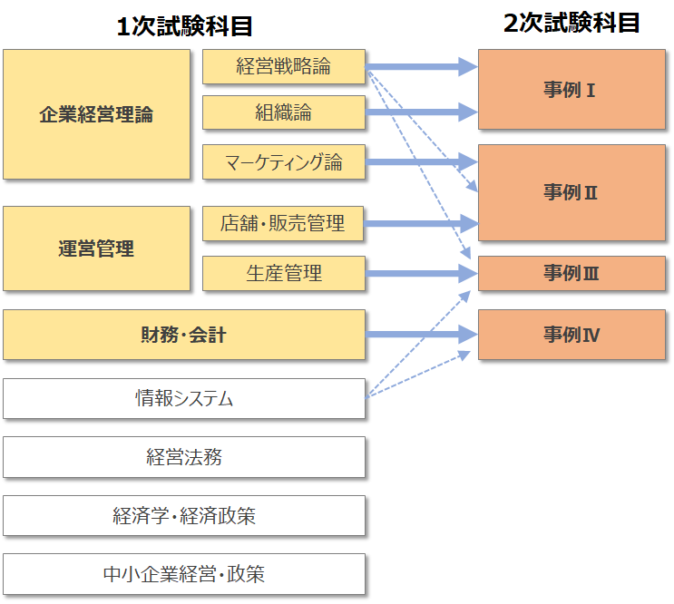 1次試験科目と2次試験科目の関連性は以下の通りです。