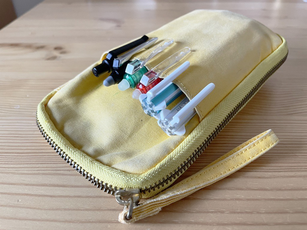 本当は1本で3〜4色使える「多色タイプ」が、持ち運びがかさばらずに理想的なのですが、フリクションの多色タイプは替芯が細くてインキの量が本当に少なくて、すぐに切れるんですよね…(個人の感想です)