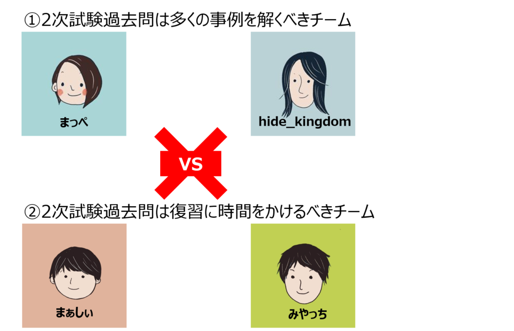 まず先攻の「多くの年数の過去問を解くべきチーム」から、多くの年数の過去問を解いた方がよいと思う理由と、2次試験の勉強を始めた当初はどのように過去問を解いていたのかをお話します。