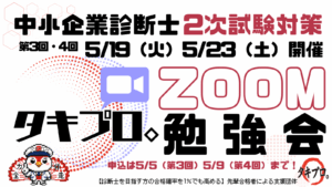 2026年4月6日 / 最終更新日時 : 2026年4月8日 ユーザタキプロ 最新勉強会 診断士合格への第一歩!「大阪リアルよろず相談会」開催のお知らせ 【4/26(日) 大阪開催】診断士受験生の「困った」に寄り添う、タキプロよろず相談会! 最新合格者のタキメンが、勉強計画から苦手科目克服までリアルな実体験ベースでアドバイスします 。大阪市立中央会館にて、初回限定の参加費無料で開催!定員15名の先着順ですので、お早めにお申し込みください。一人で悩む時間はもう終わり。私たちと一緒に合格へのロードマップを描きましょう!