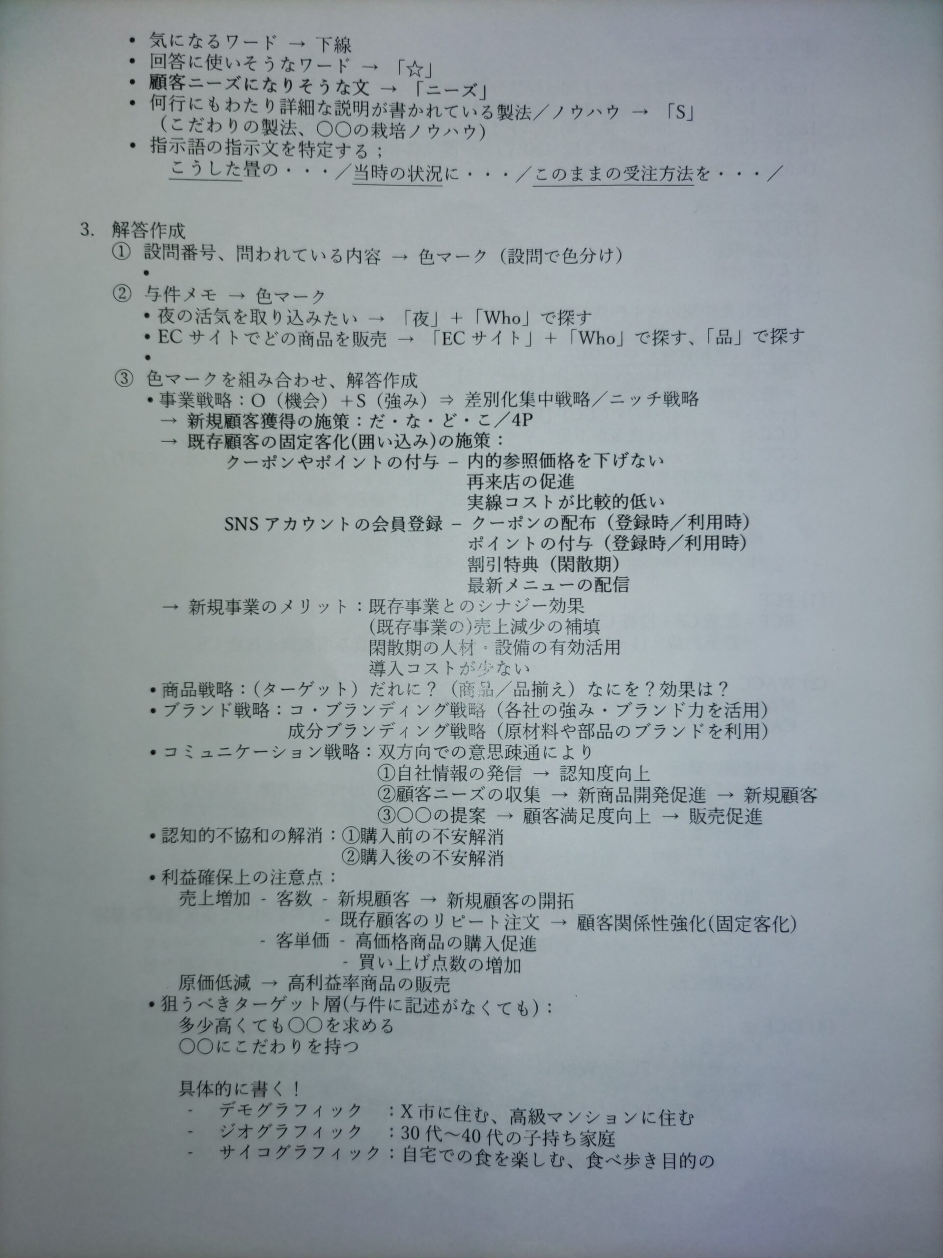 大まかな時間の使い方から始まり、設問解釈でのメモの取り方、与件文を読む際のメモの取り方、解答を作成する際の考え方・思考方法(思考経路)・フレームワークの使い方などをマニュアルに記載しています。必要であれば具体例も記載します。