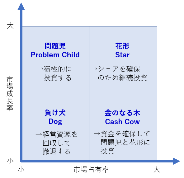 経営資源を重点的に分配する事業や今後の戦略を検討するために用いられるフレームワークです。