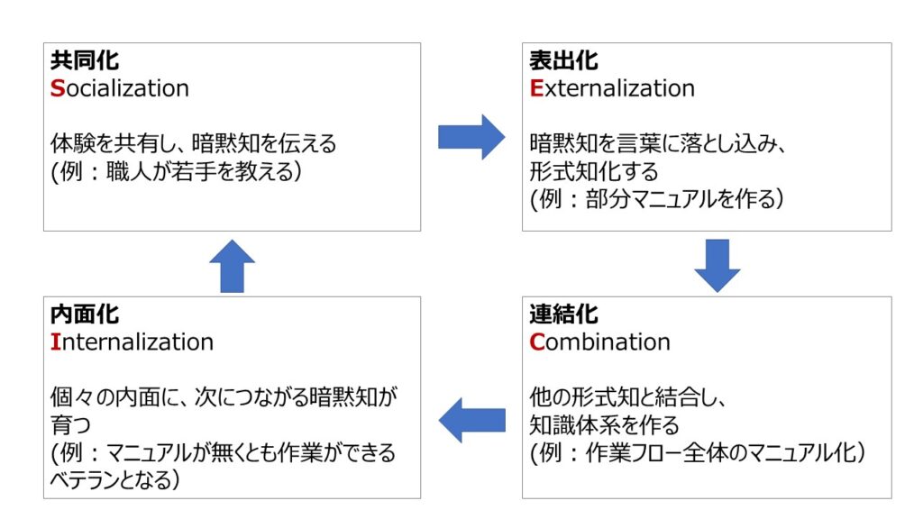 知識創造理論について詳細に知っていなくても、「暗黙知と形式知が複雑に絡み合いながら、創造的にイノベーションを起こしていく」ことを推奨しているイメージを持っていれば、