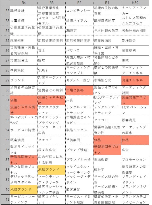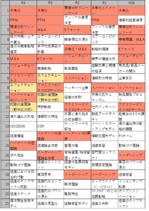 と、いうことで、まずは、直近5年分の企業経営理論の出題履歴を調べてみました。