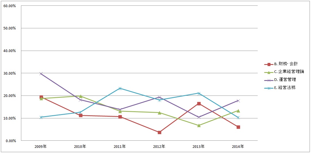 年度ごとの変動は、あまり大きくありません。ただし、合格率は、11~18%と爆発的な得点は期待できません。得点しにくい年も結構あります。ここでも、難しかった年の次の年は得点しやすくなる傾向がありますので、2015年度は、「経営法務」「財務・会計」は、得点しやすくなる可能性が高いです。