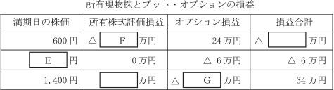 このように、現物株の所有とそれに対応するプット・オプションの所有からなるポートフォリオの損失は、最悪の場合でも△( H )万円に限定される。他方、このプット・オプションの売り手にとっては、オプションの利益は最大で ( I )万円に限定される。