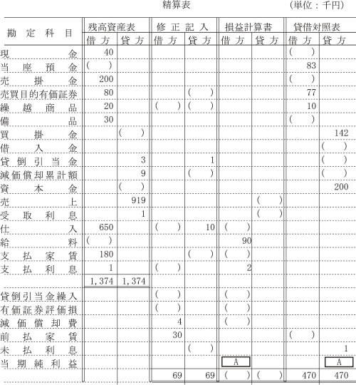 2010年1月1日 / 最終更新日時 : 2021年5月30日 タキプロ 4-8.7科目共通 【財務】平成15年 第3問 精算表 過去問サイト >財務必須論点 >財務諸表・精算表 > 第3問(H15) 次の精算表の( A )に入る最も適切なものを下記の解答群から選べ。 ア 7 イ 8 ウ 9 エ 10 オ 11 解答)エ 過去問サイト >財務必須論点 >財務諸表・精算表 > \ 最新情報をチェック / FacebookXBlueskyHatenaCopy コメントを残す コメントをキャンセルメールアドレスが公開されることはありません。 ※ が付いている欄は必須項目ですコメント ※ 名前 ※ メール ※ サイト 次回のコメントで使用するためブラウザーに自分の名前、メールアドレス、サイトを保存する。 上に表示された文字を入力してください。 Δ