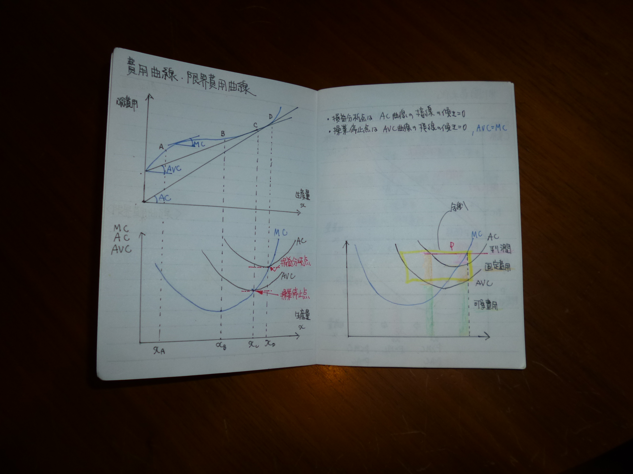 A6サイズのノートは、手のひらサイズであり、たくさんの情報を盛り込むことはできません。だからこそ、最も重要な情報のみに厳選する作業が必要になります。また、図表をできるだけシンプルにして自ら書くことで縦軸、横軸の定義や図表の意味をしっかりと理解することができます。例えば、経済学・経済政策のノートでは、費用曲線と限界費用曲線だけで見開き2ページの左側に図を手書きで記載し、右ページにポイントを記述していました。そしてこの内容を何度も見返し、写し書きをして白紙に同じ内容を書ききれるまで確実に覚えました。