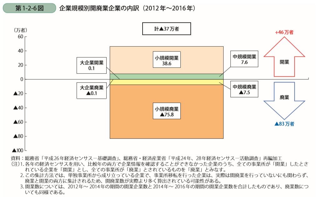 廃業企業における小規模企業の数が、開業企業における小規模企業の数を上回り、総じて見ると37万者が減少している。