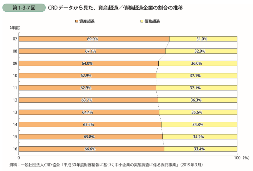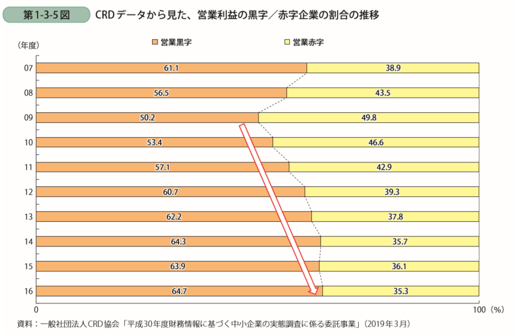 2010年以降、「営業利益の赤字企業の割合」及び「債務超過企業の割合」は、どちらも減少傾向である。