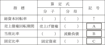 次の表において記号「↑」は指標の値の上昇を、「↓」は指標の値の低下をそれぞれ表している。各指標が良好になる場合の空欄A~Cに入る記号の組み合わせとして、最も適切なものを下記の解答群から選べ。