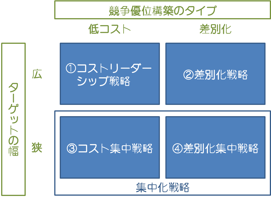 よって、上図の「①コストリーダーシップ戦略」と「②差別化戦略」は