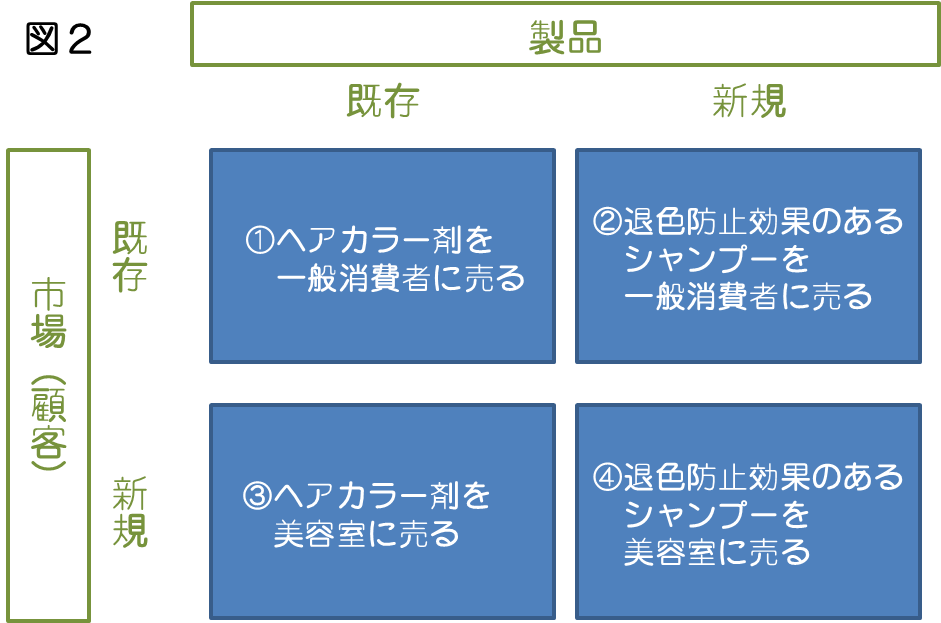 製品市場(顧客)のそれぞれを、既存新規に分けて検討します。