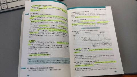さてここからは、経営法務のお話です。写真は僕が使っていた経営法務のテキストです。覚えなきゃいけないなあと~と思ってマーカーで印をつけている個所が非常に多いことが分かってもらえると思います。特に僕はバリバリの技術屋でしたので、この分野はからきしでしたから人よりマーカーは多いかもしれません。