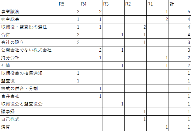 ある程度まんべんなく出題はされているものの、「事業譲渡」、「株主総会」、「取締役・監査役の選任」、「合併」は出題頻度が高いことが分かり、学習の比重を高くしておく必要があります。余裕があれば「会社の設立」や「公開会社でない株式会社」まで、抑えておけば、まずは安全ではないでしょうか。