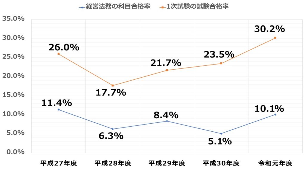 さて、経営法務の直近5年の科目合格率と1次試験合格率を見ると、こんな感じです。