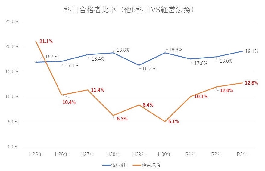 ②については、以下のグラフをご覧下さい。このグラフは、過去9年間の経営法務とその他6科目の科目合格率の推移を表しています。科目合格者には試験合格者は含みません。このグラフからH26年以降ずっと経営法務の科目合格率は、他6科目を下回っていることがわかります。つまり、これは自分だけではなく多くの方が経営法務を苦手にしていた(=得点を稼げない)ことを示しています。