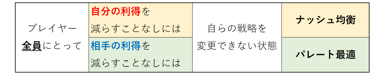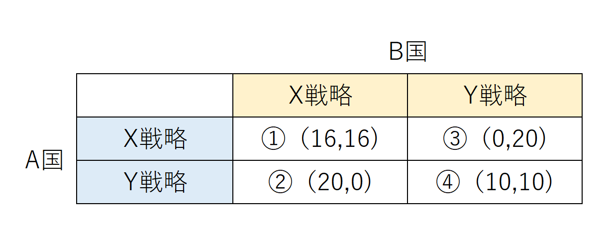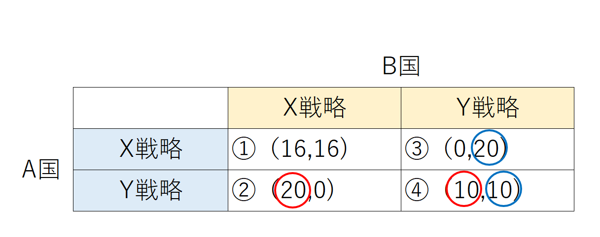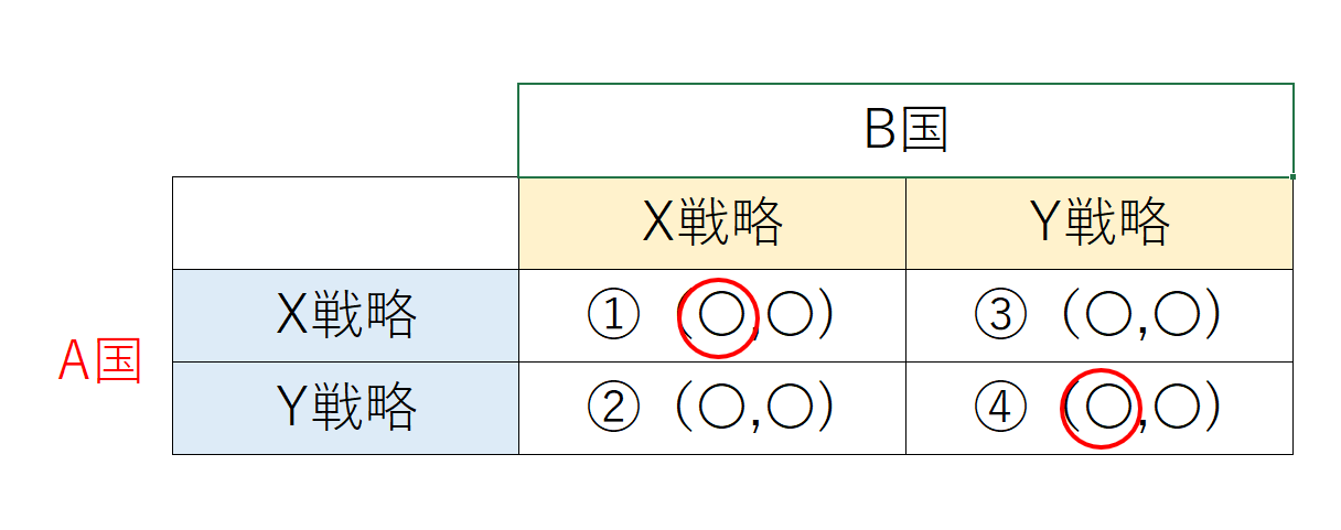 これでA国にとっては、B国の戦略がXだろうがYだろうが自国はY戦略を採用した方が得、ということになります。相手の戦略に関わらず最適となる1つの戦略、つまりこれがA国にとっての「支配戦略」です。